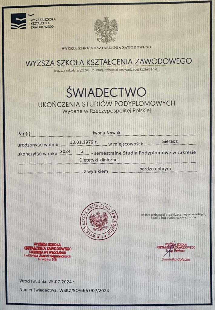 Nazywam się Iwona Nowak, jestem dyplomowanym dietetykiem, dietetykiem gastroenterologicznym i trenerem żywienia, a moja prawdziwa pasja to pomaganie ludziom w zmianie nawyków żywieniowych oraz w osiąganiu zdrowszego stylu życia. Wierzę, że stare przyzwyczajenia można skutecznie wymienić na lepsze i zdrowsze, co jest kluczowe dla długotrwałego zdrowia i satysfakcji. Zdaję sobie również sprawę, jak istotne są sport i aktywność fizyczna w dążeniu do pełni zdrowia i szczęścia. W mojej pracy koncentruję się na indywidualnym dopasowaniu diety i planów aktywności do potrzeb, możliwości, preferencji i stanu zdrowia każdej osoby, co jest niezbędne dla osiągnięcia optymalnych rezultatów. Psychodietetyka, jako ważne narzędzie, wspiera i wzmacnia ten proces, pomagając w lepszym zrozumieniu i trwałej zmianie nawyków. Dzięki bogatemu doświadczeniu oraz owocnej współpracy z doskonałym trenerem personalnym i zespołem konsultantów, stworzyłam Akademię Żywienia, Aktywności i Edukacji, której celem jest integracja tych kluczowych elementów dla zdrowego, aktywnego i szczęśliwego życia. Dążenie do harmonii w tych obszarach jest fundamentem trwałego sukcesu i satysfakcji w codziennym życiu.